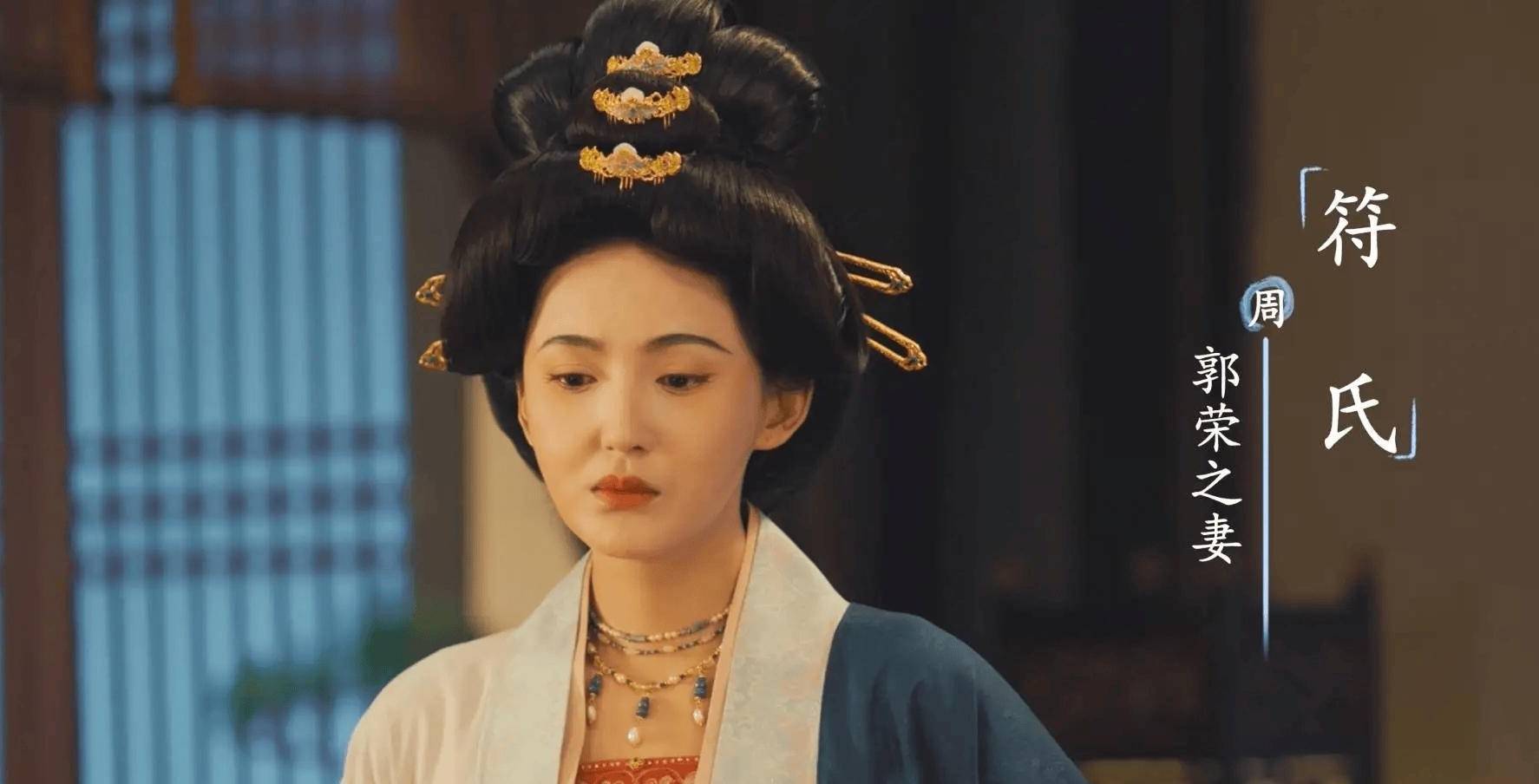 符皇后是郭荣的第二任妻子,郭荣继位后的皇后。历史上有大中小三位符皇后,大符后是名将符彦卿的长女,性格果敢,原本嫁给了李守贞的儿子李崇训。李崇训兵败后,她被郭威赏识,收为义女,嫁给了郭荣。**历史上大符后的二妹也嫁给了郭荣,小妹嫁给了赵匡义,但剧版省略了这些情节,仅出现了一位符皇后。剧版中郭荣去世后,赵匡胤发动陈桥兵变,建立北宋,符皇后迁居西宫,成为周太后。**