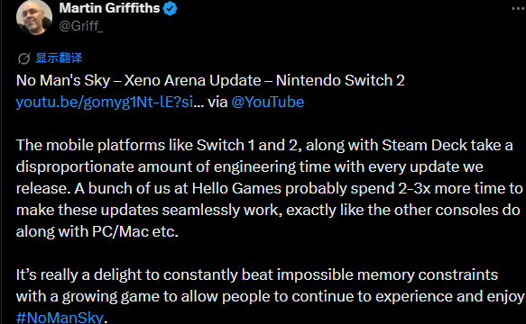 ·Hello Games工作室的引擎程序师Martin Griffiths日前发文表示,游戏已经登陆几乎全部主流平台,但是各个平台的开发难度完全不同,其中有着掌机属性的NS与Steam Deck版更新开发难度大得多,就比如这次的更新,花费的时间居然是其他平台的2~3倍。